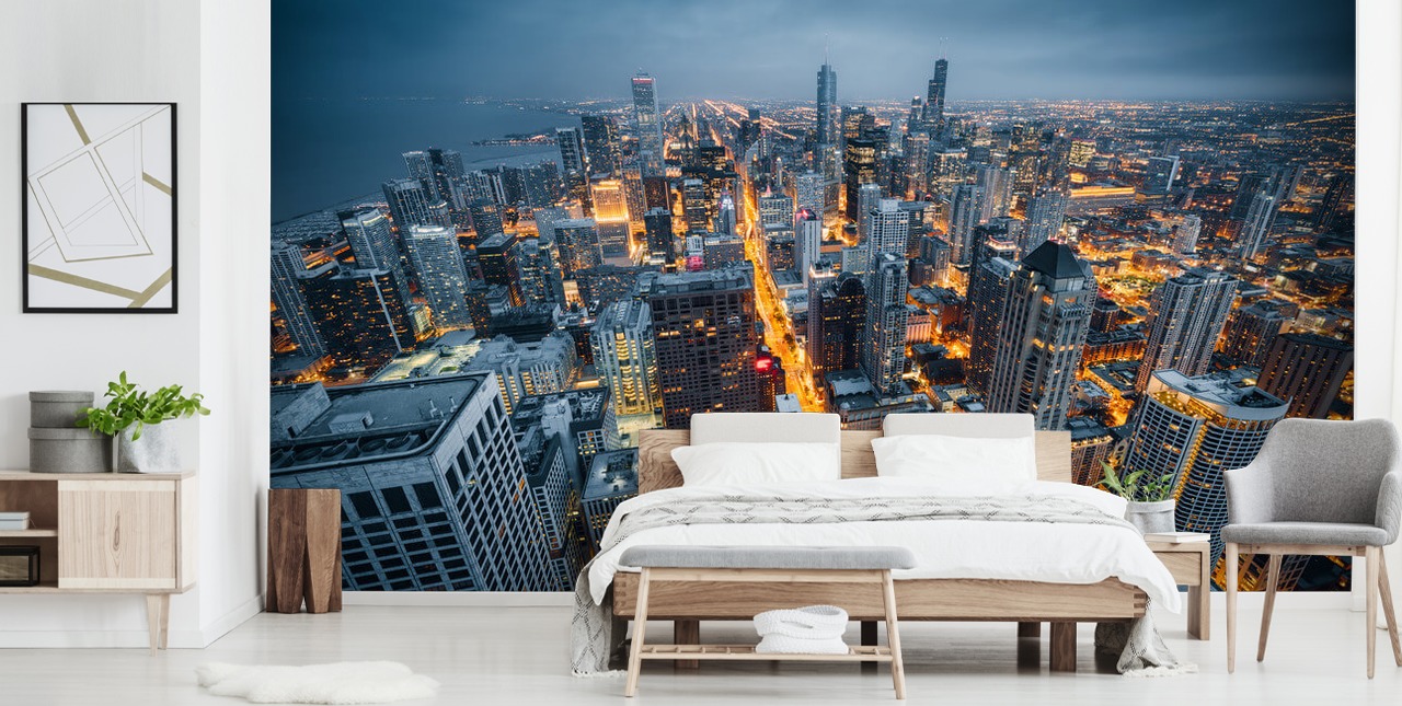 Upea Chicago Skyline Dusk taustakuva seinämaalaus kotiisi! Saatavilla osoitteessa Wallsauce.com.