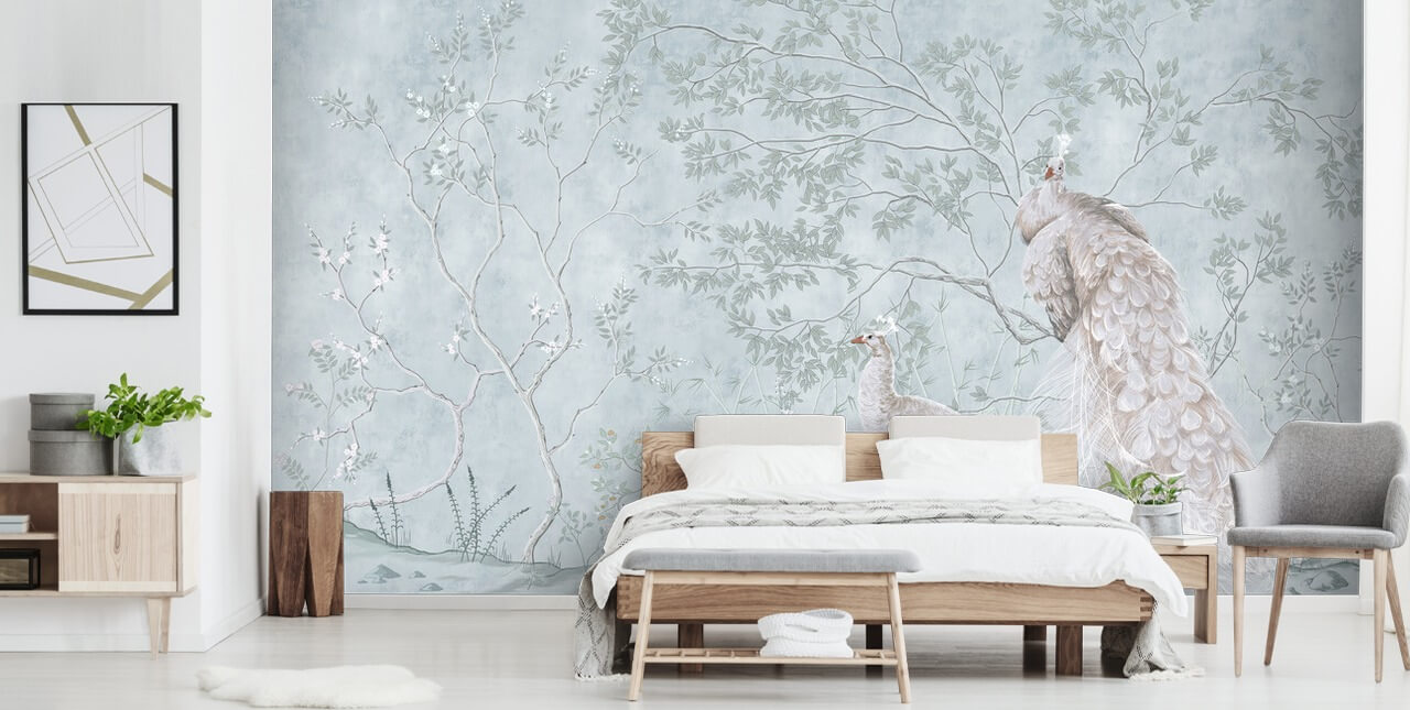 Mielestämme tämä mittatilaustyönä valmistettu Duck Egg Peacocks -taustakuvamaalaus on täydellinen seinä romanttiseen ja rentouttavaan makuuhuoneeseen. Valitse hopeanvalkoinen maali jäljelle jääville seinille riikinkukkojen värin peilaamiseksi ja valitse ankanmunansiniset vuodevaatteet, joissa on hopeakirjonta.