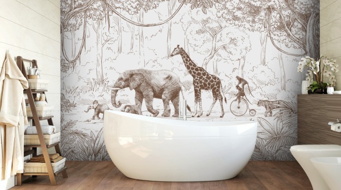erittäin hienovarainen ruskea kuvitettu viidakko valkoisella taustalla seinämaalaus