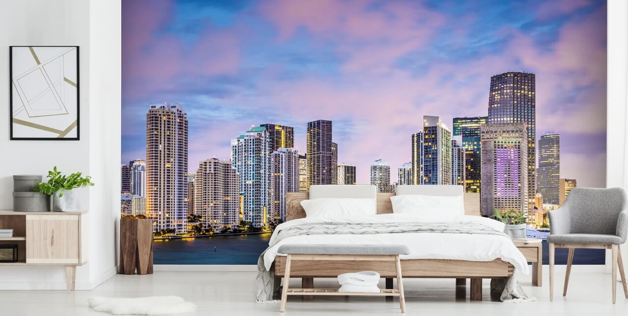 Upea Miami Skyline seinämaalaus Wallsaucesta. Tämä korkealaatuinen Miami Skyline -taustakuva on mittatilaustyönä mittojen mukaan. Helppo tilata ja asentaa .