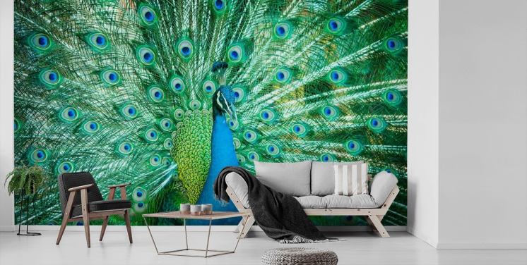Transform your space with a beautiful peacock wallpaper mural. Peacocks represent beauty, renewal, and confidence. Their stunning look adds elegance to any room, whether a bedroom, living room or home office.