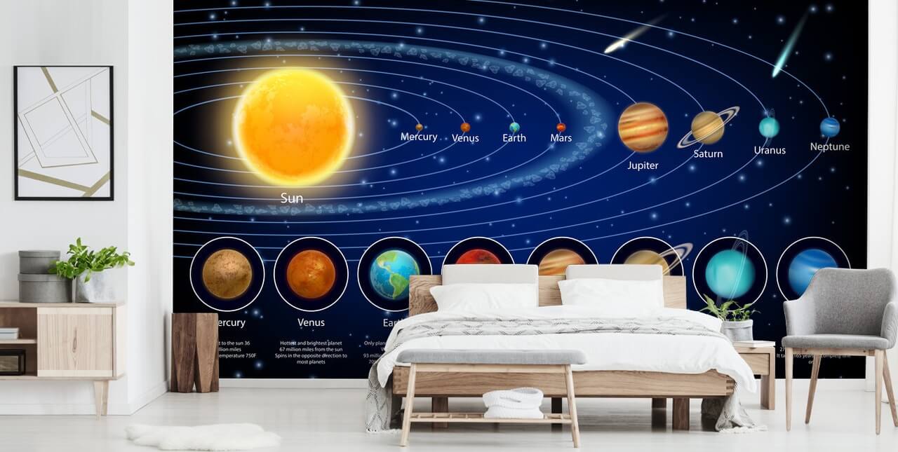 Aurinkokunnan planeetat yksityiskohtaisesti taustakuva seinämaalaus. Zoomaa kosmoksen ympärillä hämmästyttävillä Space- ja aurinkokunnan taustakuvamaalauksilla.