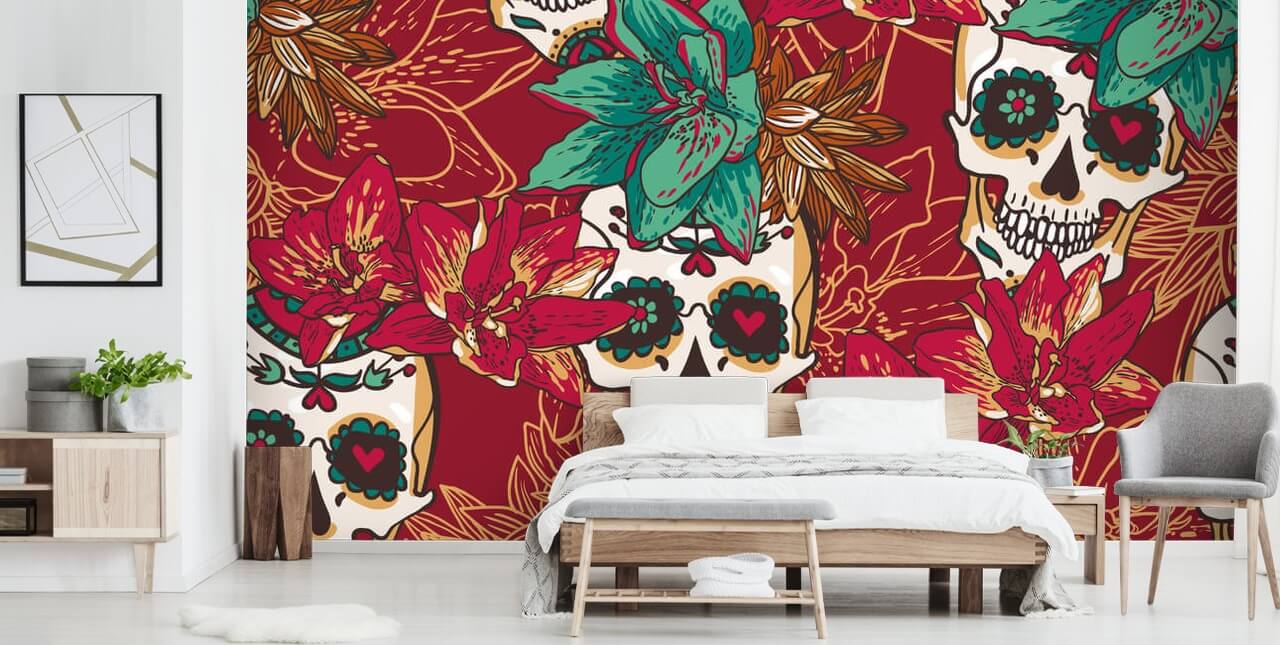 Osta tämä rocking Tattoo - Skull Hearts and Flowers -seinämaalaus. Mittatilaustyönä valmistettu ja saatavana 3 eri taustakuvamateriaalina.