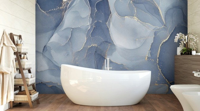 valkoinen ja sininen muokattava marmoritapetti seinämaalaus nimeltä White Marble keittiöihin ja kylpyhuoneisiin