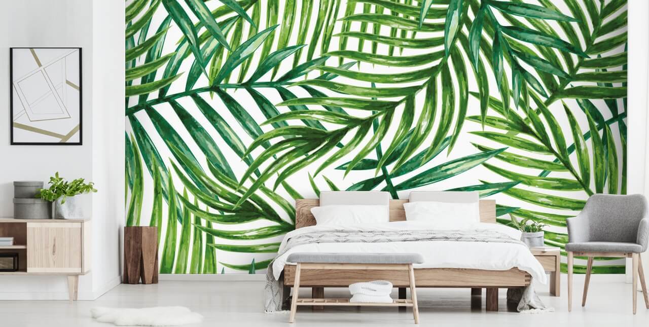Jos luot Palm Leaf -ilmeen, katso sitten enää. Tämä akvarelli trooppinen palmu lehdet Taustakuva seinämaalaus on mittatilaustyönä.