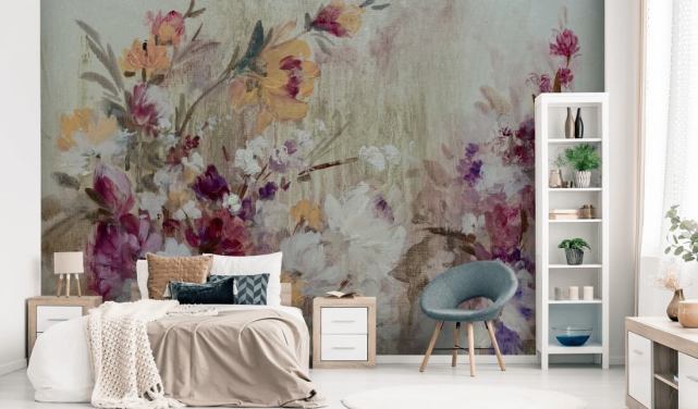 Andrea Haasen tumma kukka-taustakuvamaalaus nimeltä Vintage Flower Meadow makuuhuoneisiin, olohuoneisiin ja ruokasaleihin
