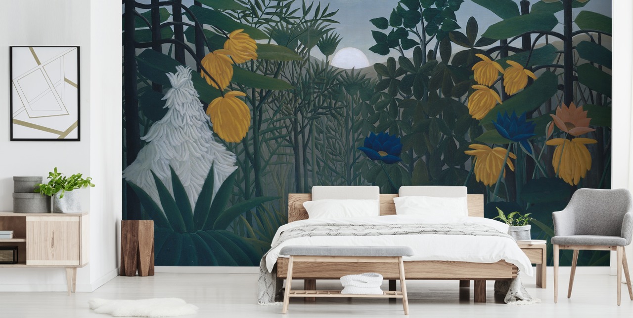 Add bold colour and character to any plain wall with Henri Rousseau's The Repast of the Lion wallpaper mural.