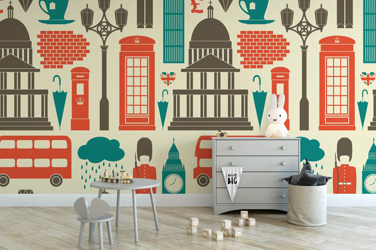 Avec de nombreux accessoires pour bébés sur le thème de Londres disponibles dans nos rues, vous trouverez facilement des pièces de bon goût qui complèteront ce magnifique papier peint pour chambre d'enfant. Imaginez cette peinture murale pour enfants à côté d'un lit blanc, d'un tapis bleu sarcelle et d'un fauteuil rouge dans le coin de la chambre de votre bébé. Tout simplement magnifique et classique.