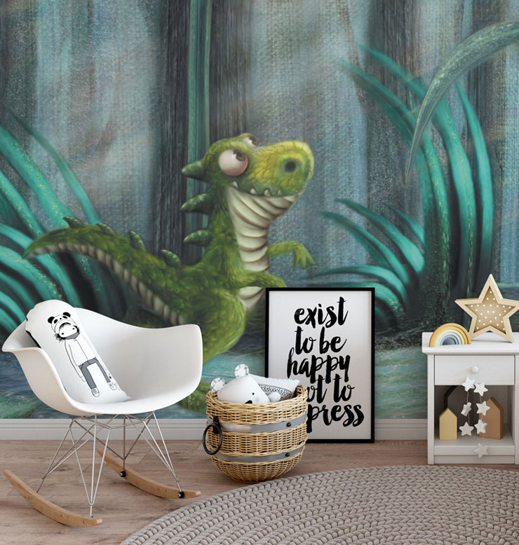 Cette fantastique fresque de dinosaures pourrait être tirée directement d'un livre de contes pour enfants ! Appréciez les tons apaisants de vert et de bleu combinés aux doux rayons de soleil qui se faufilent entre les arbres. Associez-la à un décor simple, blanc et gris, pour que cette peinture murale illustrée par des enfants soit le centre d'attention.