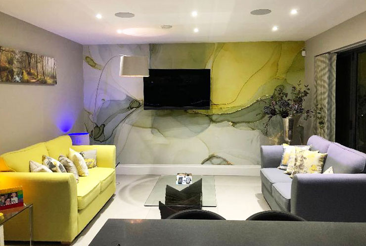 Donnez à votre maison l'aspect d'un temple de marbre sans avoir à vous envoler pour la Grèce. Si vous avez de la place, un mur d'accent avec une peinture murale en marbre est tout à fait divin. Voyez comme cette aquarelle grise et moutarde est magnifique dans la maison de notre cliente Jan.