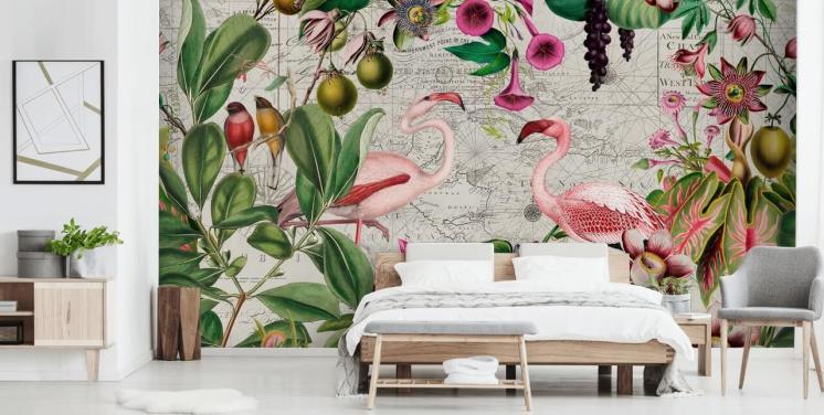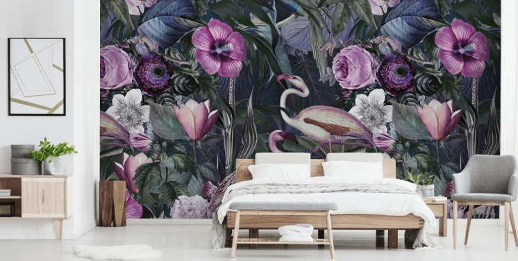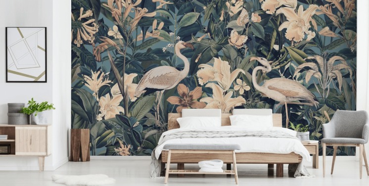 papier peint flamants roses orange pâle et fleurs dans la jungle verte