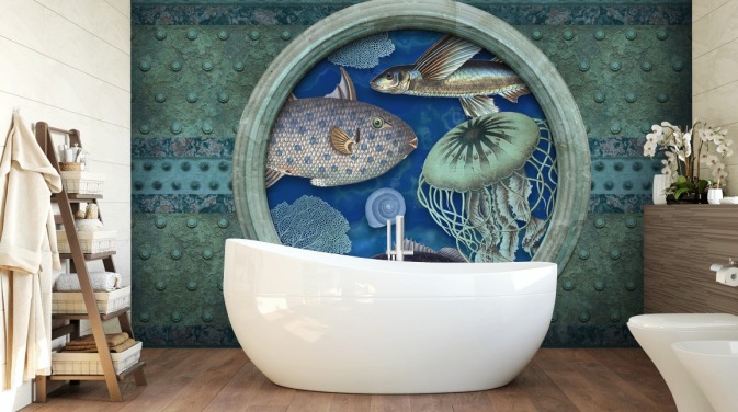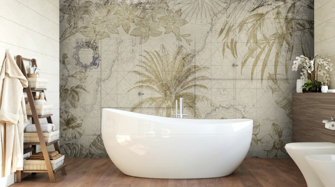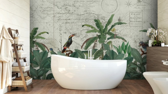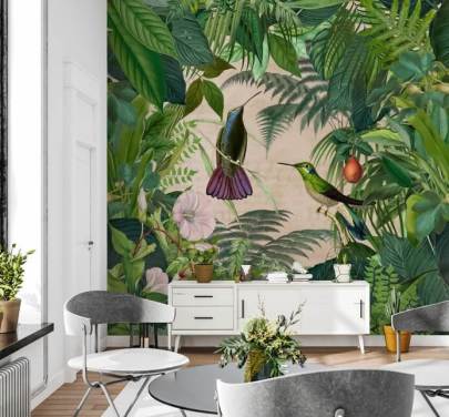 papier peint mural coloré d'oiseaux tropicaux appelé Tropical Summer Garden par Andrea Haase pour les salles de bain et les cuisines