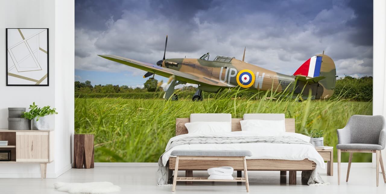 Superbe fresque murale ouragan de la bataille d'Angleterre sur l'herbe. Ce papier peint de haute qualité est fabriqué sur mesure à vos dimensions.