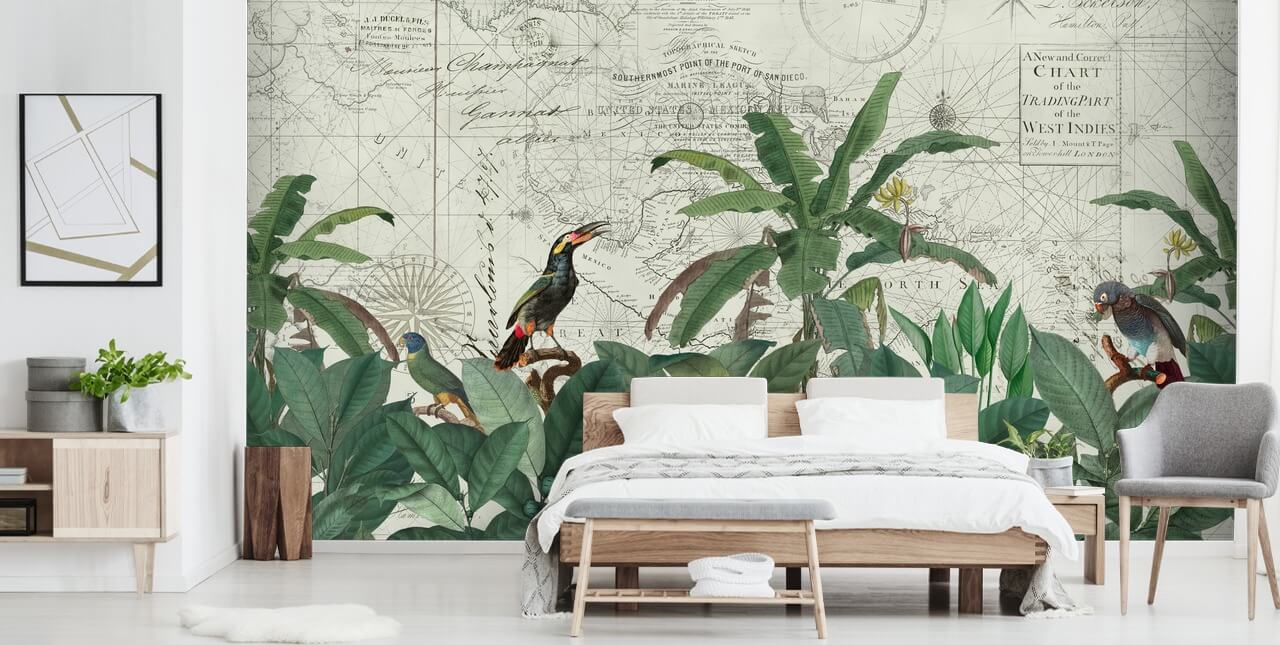 Un fond de carte vintage, des plantes vertes feuillues et des oiseaux exotiques, ce magnifique papier peint de la jungle apportera certainement une touche tropicale dans n'importe quel espace, qu'il s'agisse d'une chambre, d'un bar ou d'un couloir ! Gardez une palette de couleurs blanc cassé et vert dans le reste de la pièce et choisissez des meubles en bois et en osier pour refléter ce design inspiré de la nature.