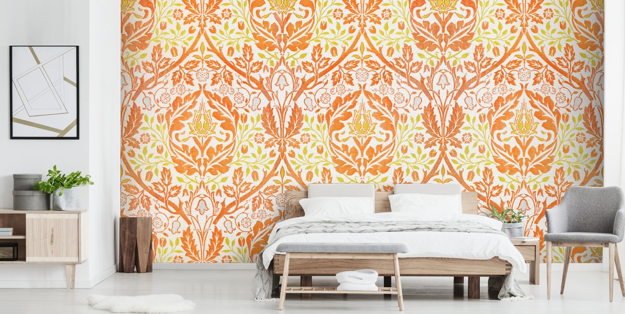 Décoration murale complexe orange et jaune de William Morris. Fabriqué sur mesure pour s'adapter au mur.