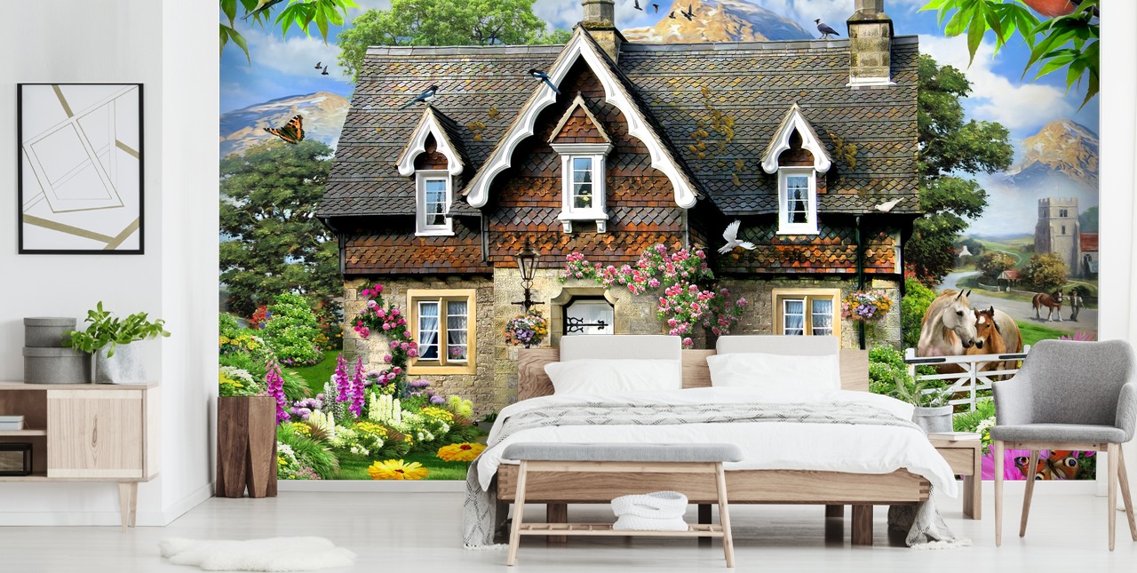 Transformez un mur simple et neutre en une scène captivante et colorée avec la peinture murale Hillside Cottage de Howard Robinson.