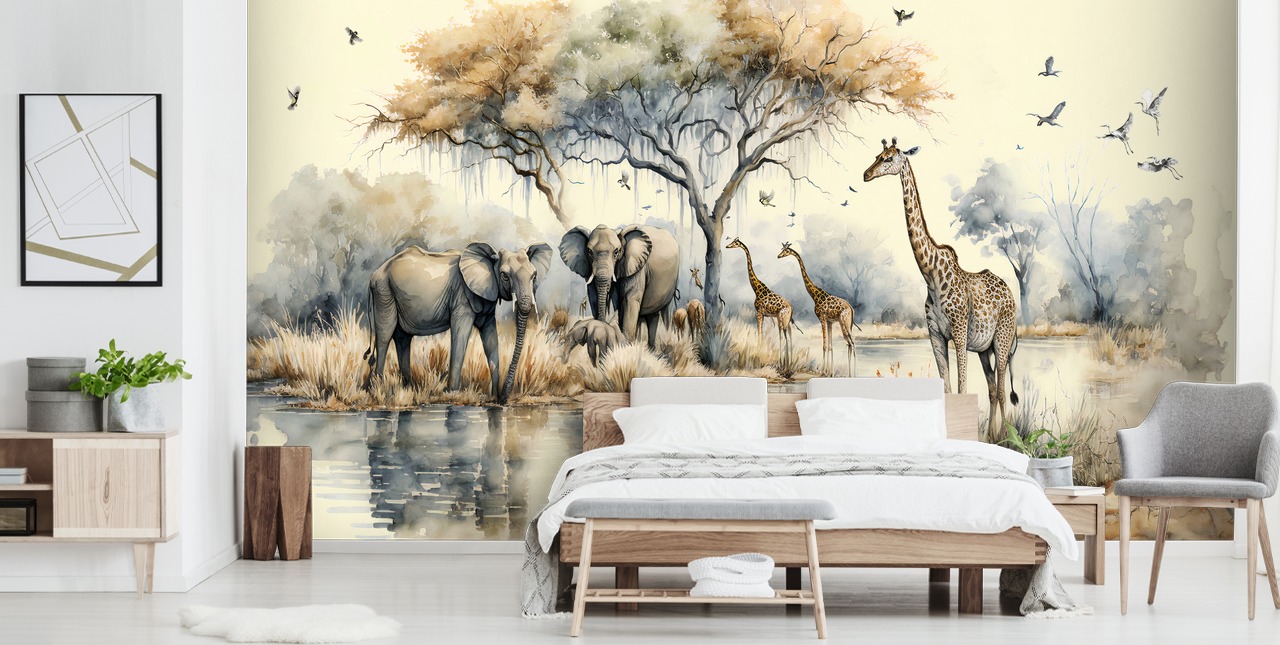 Illustration d'éléphants et de girafes dans la savane - Safari Oasis Wallpaper
