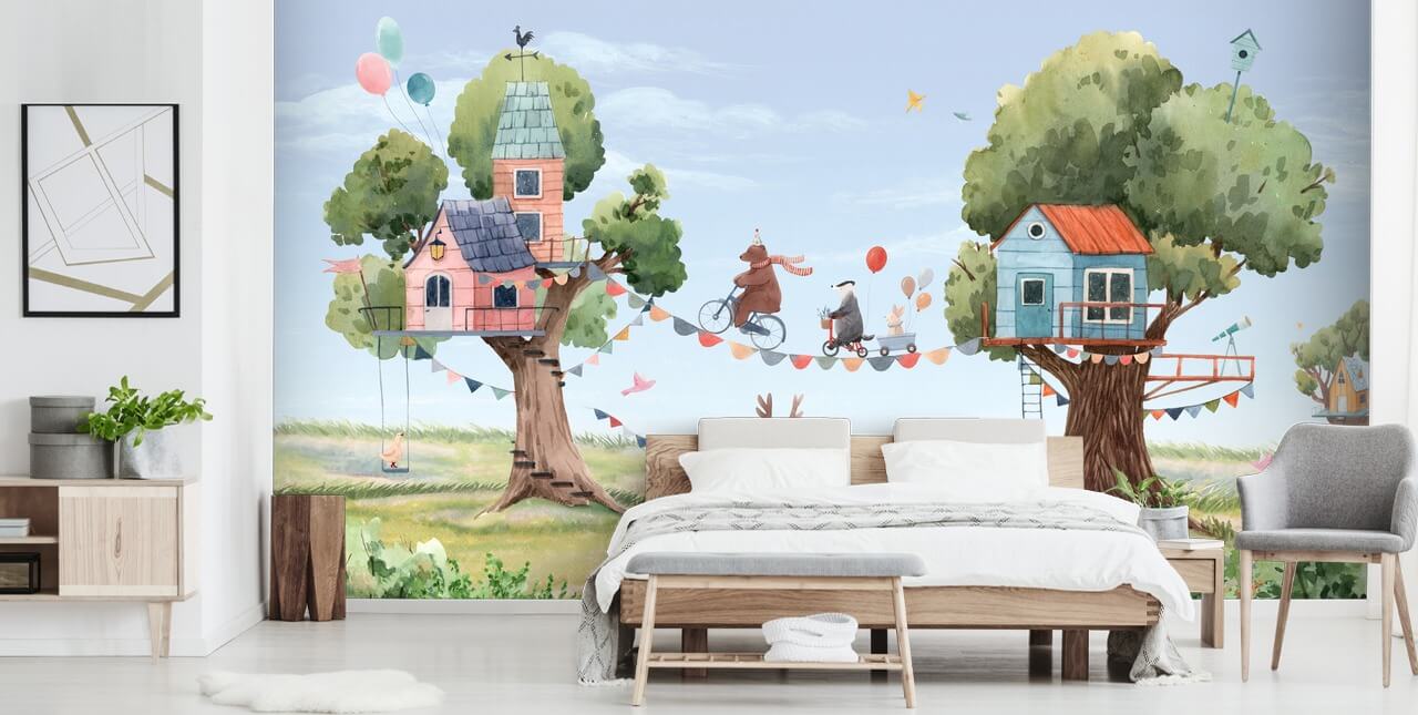 Créez un joli mur d'accent dans la chambre de votre bébé avec cette peinture murale personnalisée Treehouse Party de Kikki Belle.