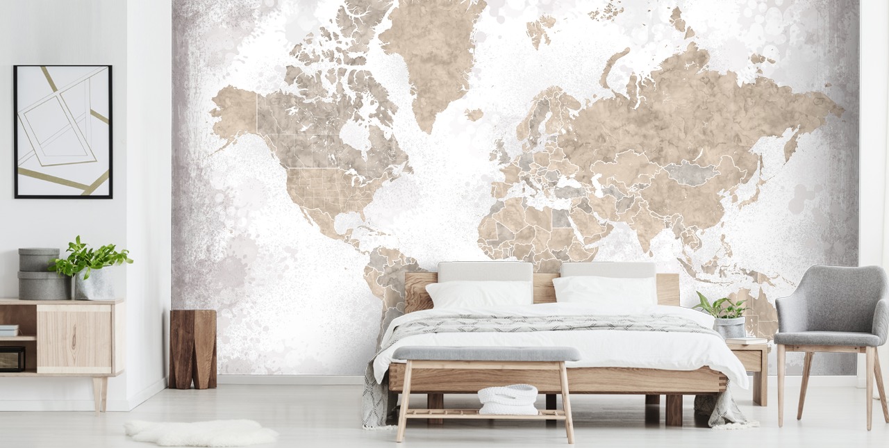 Faites entrer le monde chez vous avec cette élégante carte du monde murale aux couleurs naturelles de pierre.