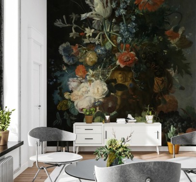 papier peint d'art floral appelé Still Life with Flowers and a Watch d'Abraham Mignon pour les salons et les chambres