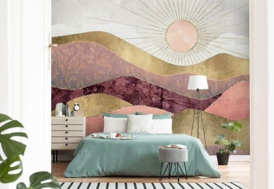 papier peint mural rose, violet et doré à effet lever de soleil appelé Blush Sun par SpaceFrog Designs pour chambres à coucher