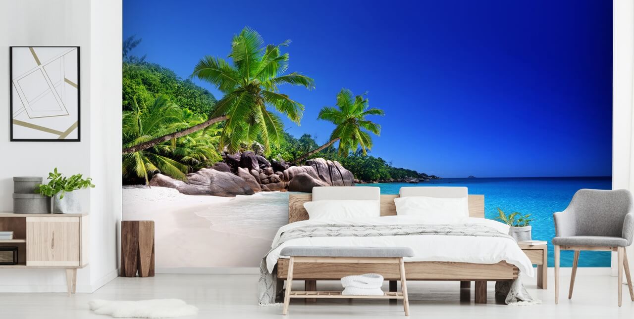 Décorez votre mur avec ce papier peint Plage tropicale de l'île de Praslin, Seychelles. Fabriqué sur mesure pour s'adapter à votre mur.