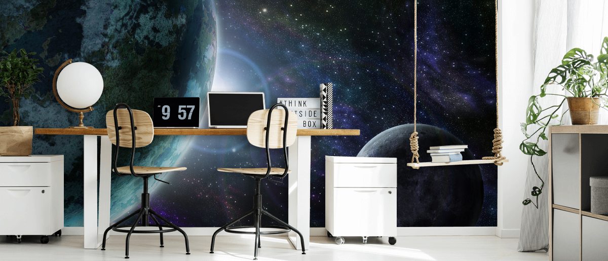 Superbe fond d'écran Blue Planet Earth in Outer Space de Wallsauce. Cette fresque spatiale hypnotisante est faite sur mesure pour s'adapter à vos dimensions.