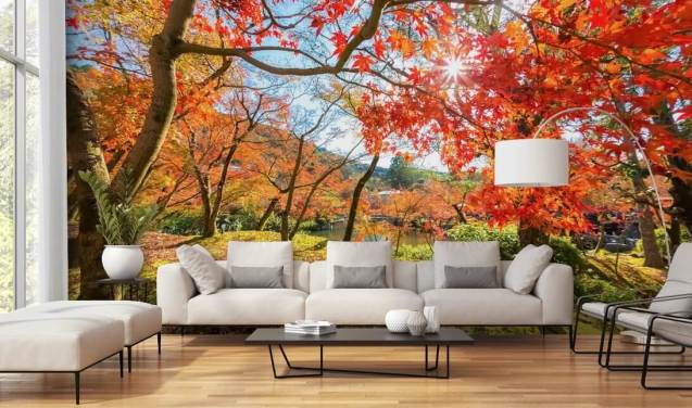 papier peint mural de forêt personnalisable rouge et vert appelé Autumn Scene with Red Trees pour les salons et les salles à manger