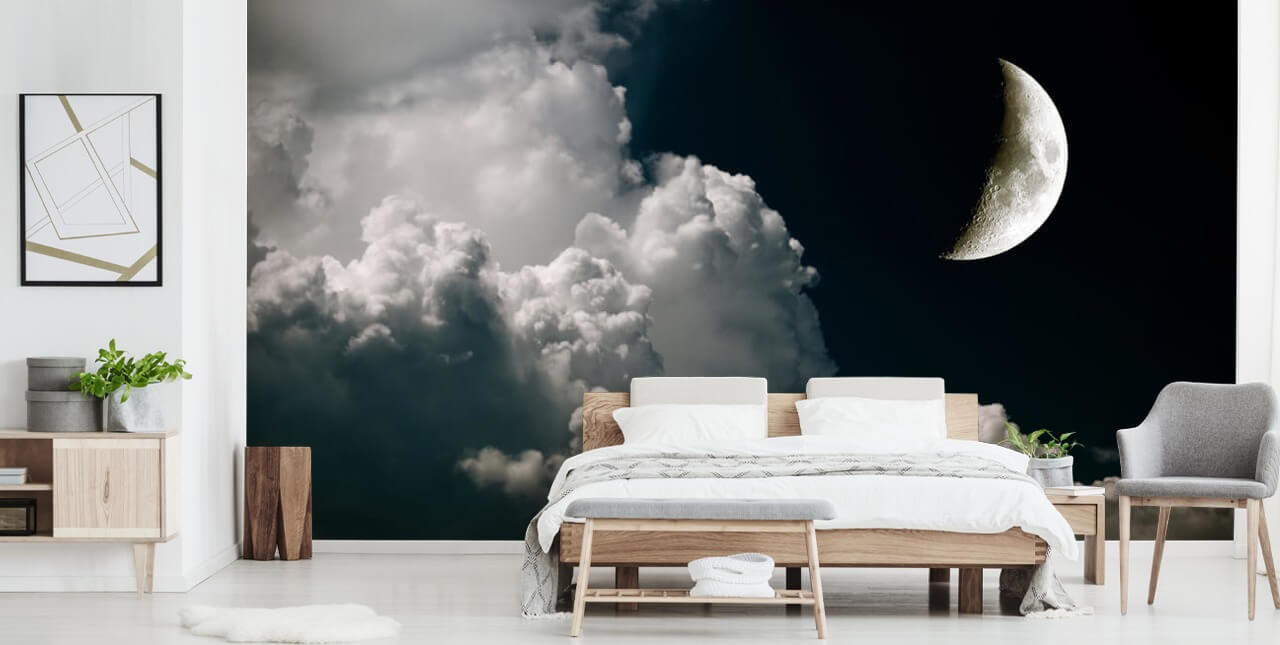 Procurez-vous cette magnifique peinture murale du croissant de lune dans votre maison pour transformer complètement votre décoration intérieure. Imaginez ce papier peint lune de rêve dans votre chambre principale. Choisissez un décor gris tel que des tables de chevet et une armoire, ainsi que des housses de couette blanches et nettes. Même à travers quelques accessoires de pièce aux accents métalliques tels qu'une lampe et des poignées de placard.