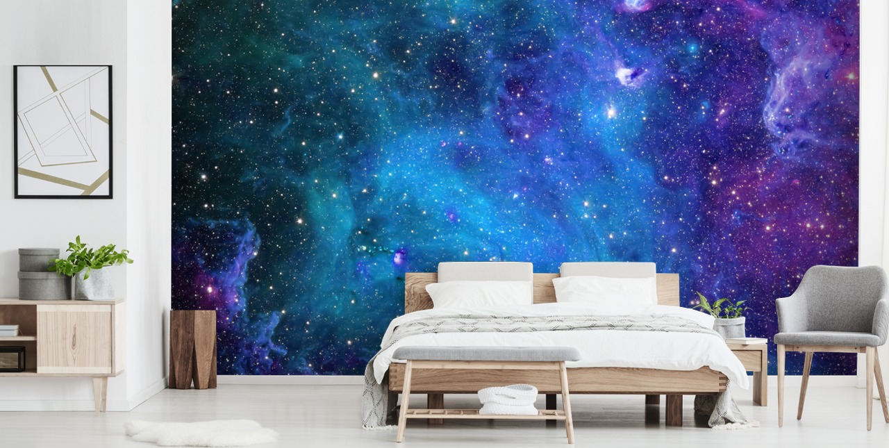 La beauté des papiers peints en forme de nébuleuse réside dans le fait qu'ils sont magnifiques dans n'importe quel type de pièce, mais ils sont particulièrement beaux lorsqu'ils sont installés au plafond. Ces papiers peints bleu foncé ajoutent de la profondeur et créent l'illusion de plus d'espace dans une maison, car leur apparence semble infiniment vaste.