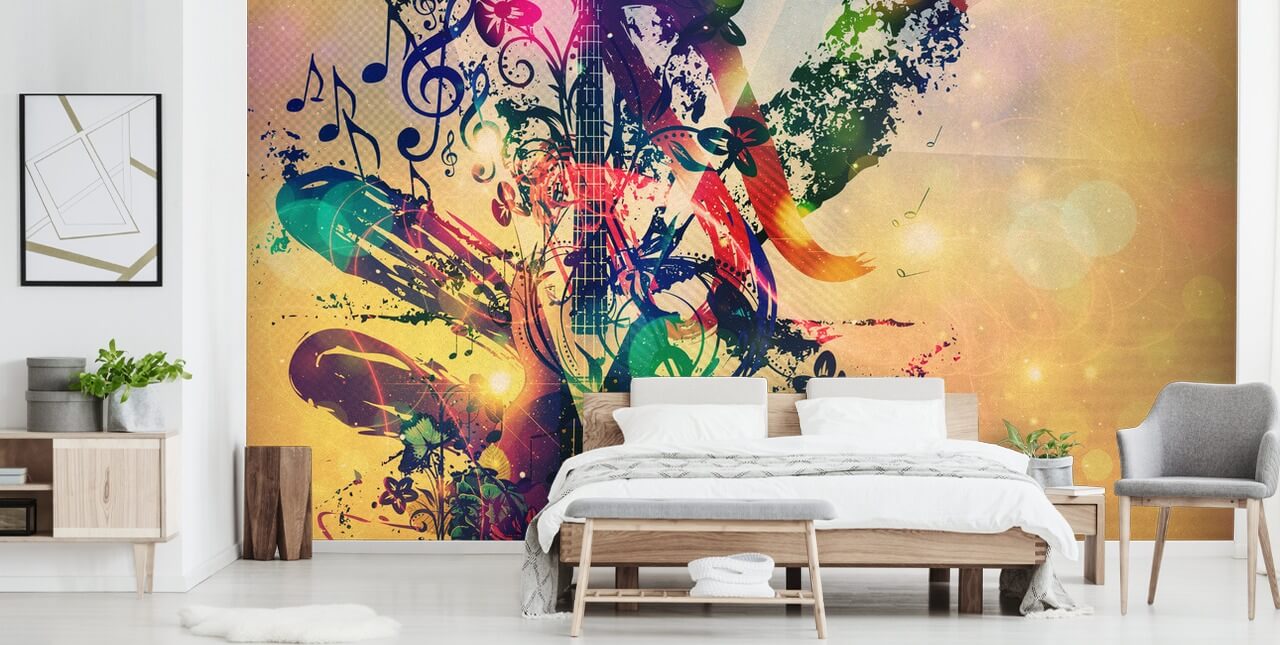 Une image époustouflante et colorée. Cette peinture murale intègre des éléments musicaux abstraits sur un fond orange.