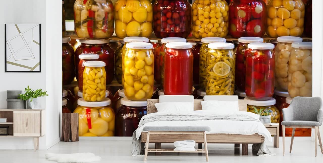 Décorez votre mur avec ce papier peint coloré Jars of Pickles. Fabriqué parfaitement sur mesure pour votre mur.