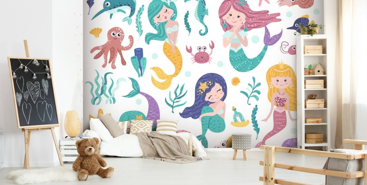 Jetez un œil à ce papier peint Mermaid Friends ! Fabriqué sur mesure pour s'adapter parfaitement au mur de la chambre de votre enfant.