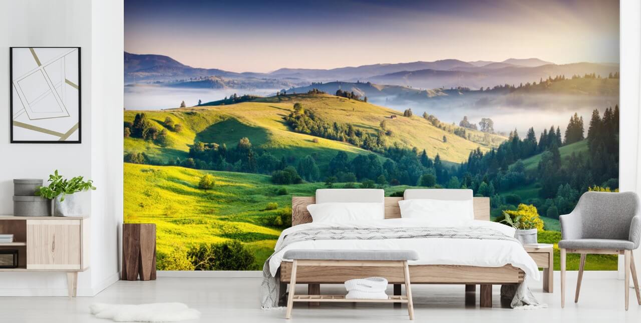 Profitez de la brume matinale dans ce superbe papier peint de paysages de montagnes. Disponible en papier peint à coller au mur ou en papier peint à décoller et à coller.