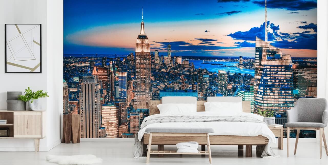 Si vous voulez un papier peint de New York plein de vie et de vitalité, choisissez parmi l'incroyable fresque murale Shine on NYC. Avec ses magnifiques couleurs or rose contrastant avec le bleu cobalt, cet horizon de New York attire indéniablement le regard. Il transformera n'importe quelle pièce de la maison et fera chuter la gueule de vos amis et de votre famille !
