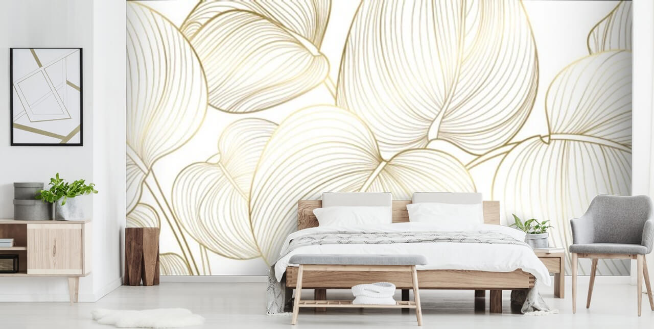 Associez ce papier peint blanc cassé et doré à des accessoires de chambre dans des tons similaires. Imaginez une literie blanche sur un lit à cadre doré, des coussins dorés scintillants et un tapis blanc en fourrure !