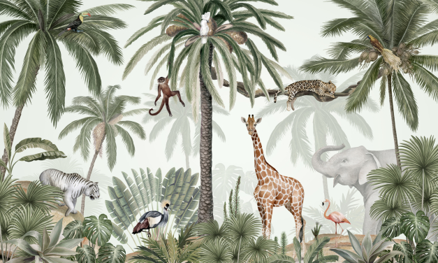 papier peint blanc, noir, vert sauge avec animaux des bois