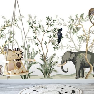 papier peint mural coloré d'animaux de dessin animé personnalisable appelé Animals in the Jungle pour chambre d'enfant
