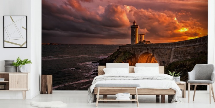 Decorazione murale con faro costiero al tramonto