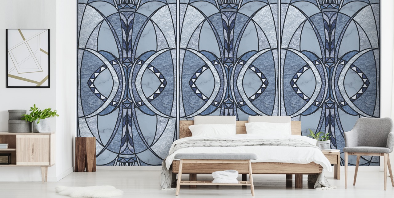 Posiziona questo bellissimo murale Art Deco Fantasy 3 dietro il tuo tavolo da pranzo in legno scuro, composto da una miscela di piatti blu e bianchi e bicchieri blu sbiaditi. Usa delle tovagliette in argento con le tue posate in argento. Scegli un'illuminazione a sospensione sospesa sul tavolo con sfumature blu scuro. Al centro del tavolo posiziona un vaso alto e sottile e riempilo con una miscela di fiori blu e canne dorate finte. Ora puoi ospitare molte cene eleganti!