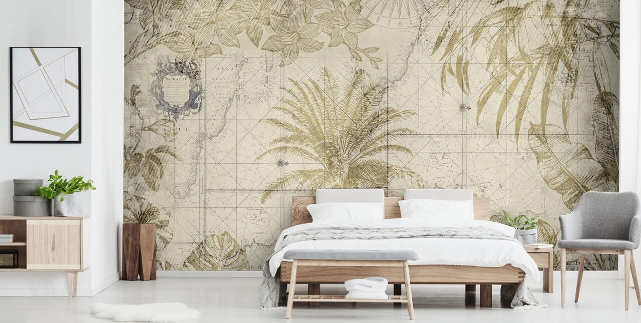 Vuoi creare un'atmosfera tropicale nella tua casa? Allora scegliete questo bellissimo murale Beige Tropical Fauna and Map di Wallsauce.com. Con splendidi beige e tonalità crema, questa elegante carta da parati vintage con mappa creerà sicuramente una parete di tendenza di lunga durata nella tua casa.