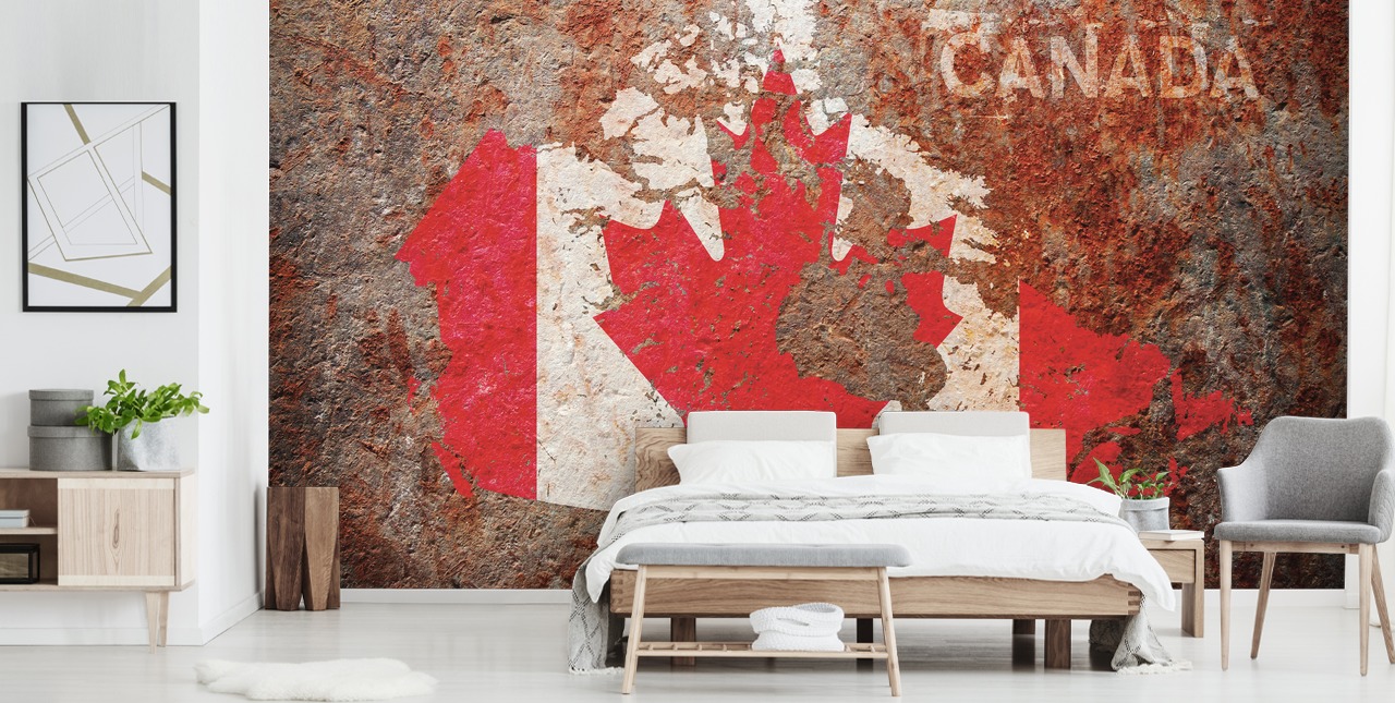 Celebra il Canada nel tuo spazio abitativo o lavorativo con questo elegante murale di carta da parati Canadian Flag on Concrete di Michael Tompsett.