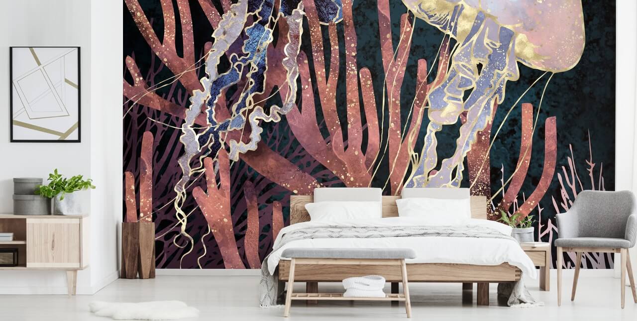 Perché non godersi questa carta da parati di design con meduse sulla parete del tuo bagno? Posizionalo sulla parete del tuo bagno e abbinalo a pareti scintillanti dipinte in argento! Oppure, se vuoi goderti un interno scuro e drammatico, perché non dipingere le pareti con una vernice scura come l'inchiostro per rispecchiare la tonalità di sfondo nel design?
