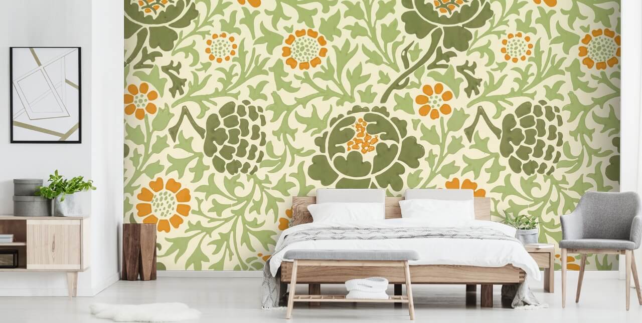 Perché non creare un fattore wow nel tuo ufficio a casa scegliendo questa carta da parati verde e arancione? Posiziona questa carta da parati floreale dietro la tua scrivania, dipingi le pareti circostanti con un tono bianco sporco o abbraccia il colore scegliendo una tonalità verde salvia! Per ordinare, chiamaci o compila il modulo in questa pagina.