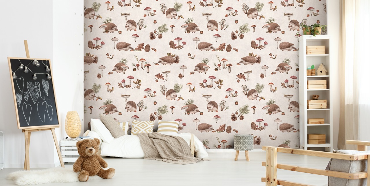 Se il tuo bambino ama giocare tra le foglie ogni autunno, adorerà questa affascinante carta da parati Happy Hedgehogs di Kikki Belle.