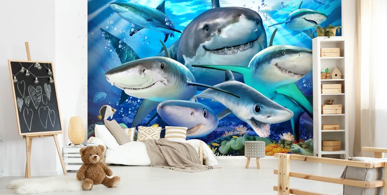 Adornate la vostra parete con questo simpatico murale Shark Selfie. Una carta da parati a forma di squalo per bambini realizzata su misura per adattarsi perfettamente alla tua parete.