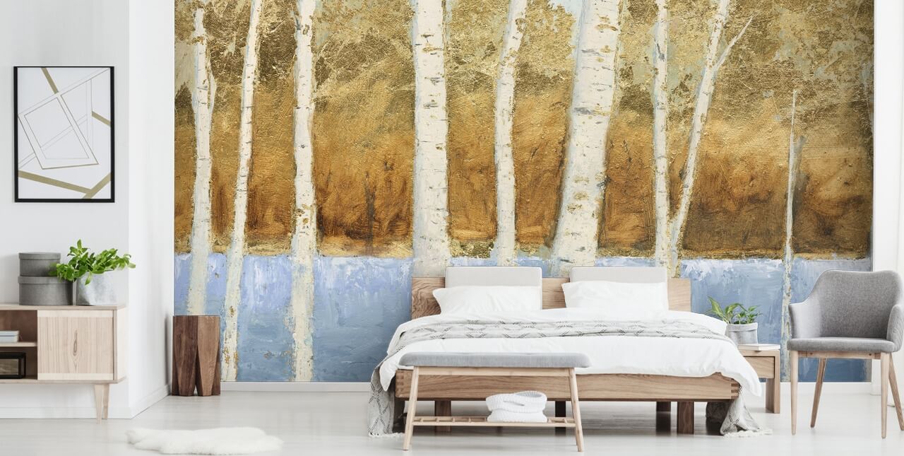 Pensiamo che questa splendida carta da parati in betulla sarebbe favolosa con un mix di decorazioni blu chiaro, bianco sporco e oro. Perché non scegliere un divano bianco sporco con gambe in oro giallo per un look elegante? Oltre a questo, scegli l'illuminazione dorata come un moderno lampadario in oro. Fai risaltare i toni azzurri del lago con cuscini decorativi blu pastello e un tappeto da abbinare.