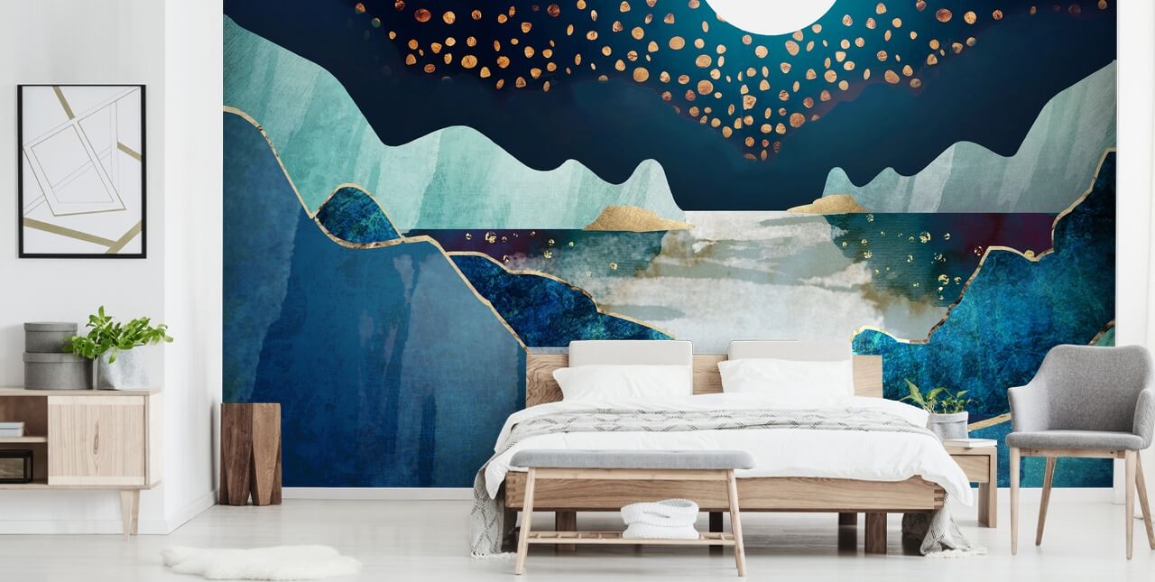 Goditi il bagliore della luna nella tua camera da letto con questo murale di carta da parati su misura Moon Glow progettato da Space Frog Designs.