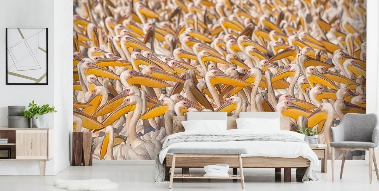 Uno scatto fantastico scattato in natura, questa carta da parati pellicano è quasi astratta a causa delle masse di pellicani che corrono tutti insieme! Perché non godervi questa carta da parati con uccelli nel vostro salotto grigio e senape? Abbinalo a un divano grigio e una poltrona gialla, un tappeto grigio e tende gialle?
