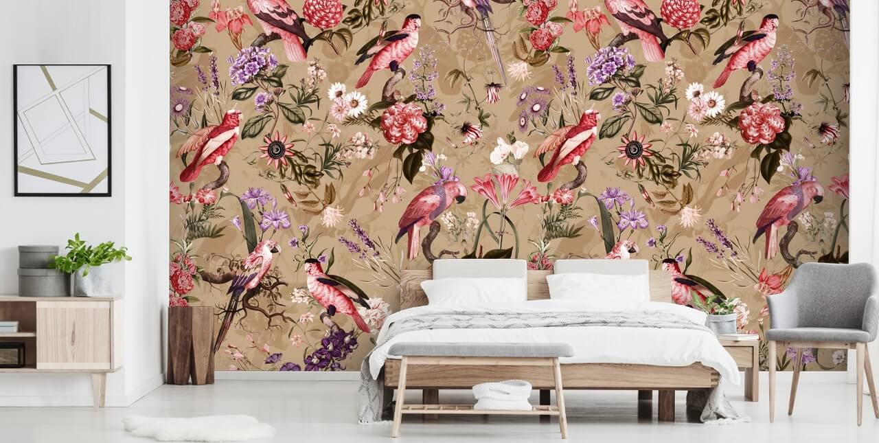 Porta un look vintage nella tua casa con questo murale di carta da parati Pink Perching Parrots su misura.